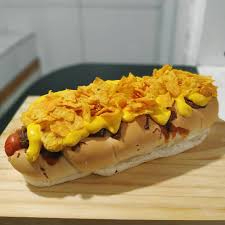 Salsicha, bacon, cheddar e Doritos.
