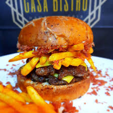 Hambúrguer, queijo, cheddar, bacon, batata fritas (dentro do lanche), alface e tomate.