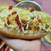 Salsicha, filé de frango empanado, catupiry, milho e batata palha.