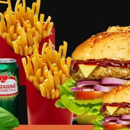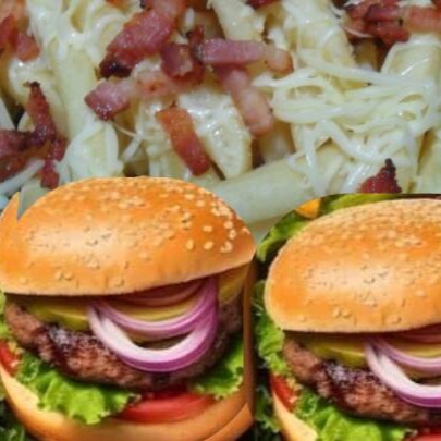 ️ 2 Hambúrgueres de Pernil suculentos 1 fatia de mussarela alface tomate cebola roxa ️ 1 Porção caprichada de batata com catupiy e bacon Combinação Ferfeita ,Serve 2 Pessoas