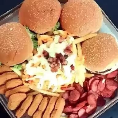 4 lanche 3 porção. 4 hamburguer Pão Brioche,burguer de carne bovina + queijo cheddar + queijo prato,batata com bacon e Catupiry+1 porção de nuggets+1 porçao de calabresa serve 4 pessoas.