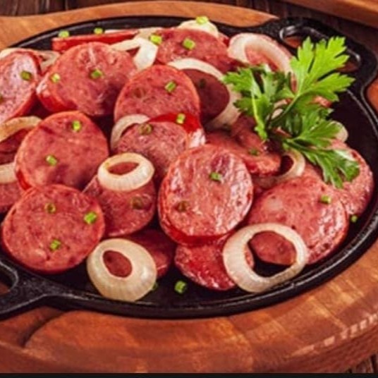 Porção ;calabresa ,tiras finas de cebolas ,acompanha pão Experimente essa delicia.