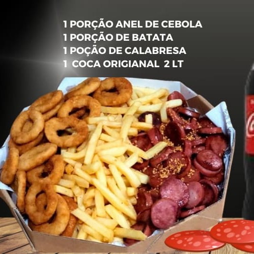 1 Porção De Calabresa 1 Poção De Anel De Cebola 1 Porção De Batata 1 Coca Origianal 2 Lt