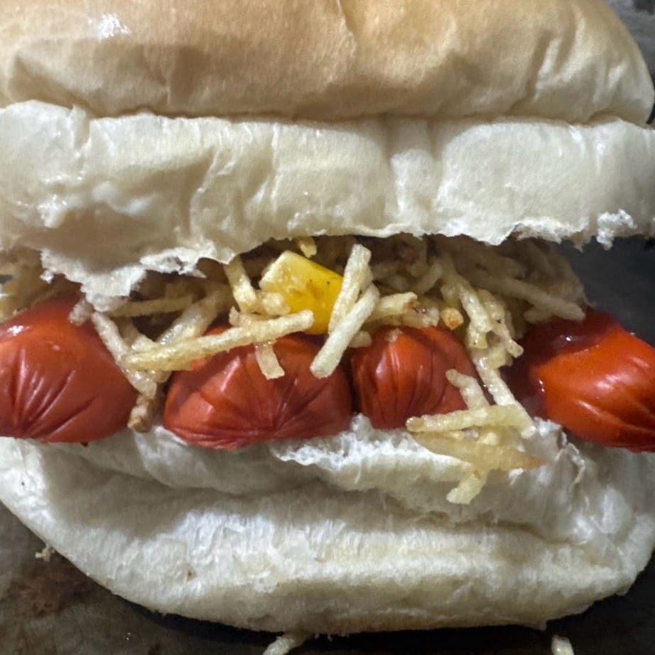 Pão de hamburguer, 2 Salsichas, Batata Palha, Cheddar, Frango em cubos, Ketchup,Mostarda, e Molho El Shaday.