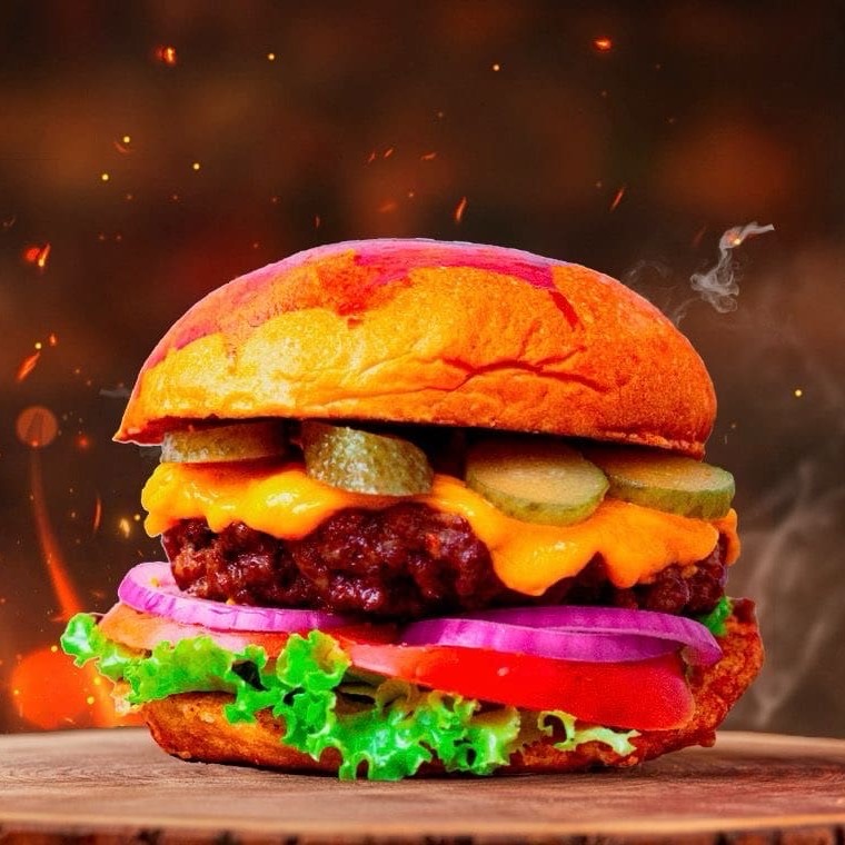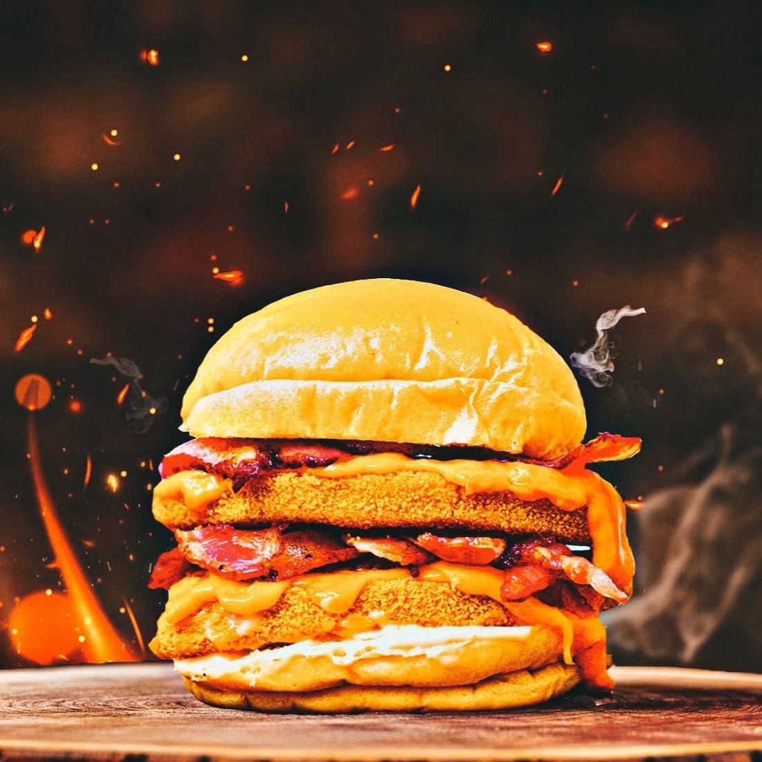 Pão de brioche, file de frango empanado, queijo prato, bacon, Catupiry, alface, tomate, cebola Roxa e molho el shaday.