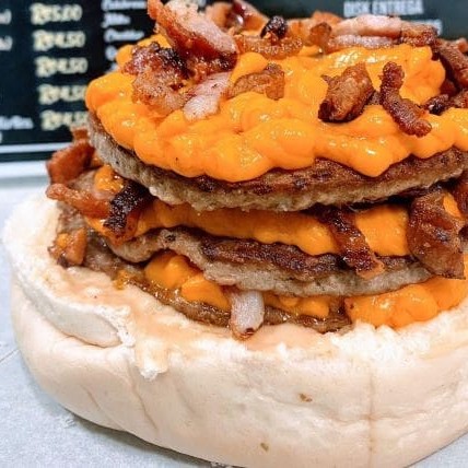 Pão de hamburguer, 3x hamburguer de 90g cada, 3 camadas de cheddar Original e 3 camadas de bacon e pra finalizar molho el shaday.