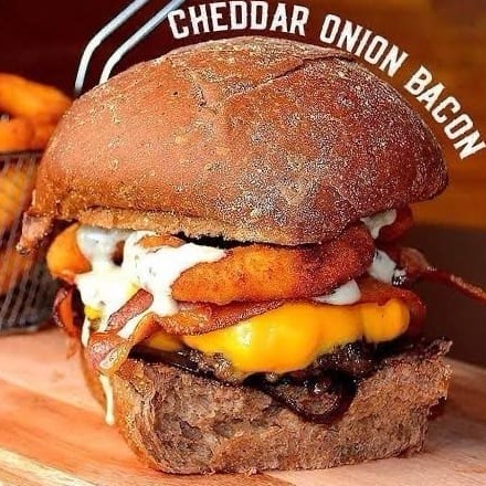 Pão Australiano, Hambúrguer Artesanal de 150g, Cheddar, Onion Rings e Molho El Shaday.