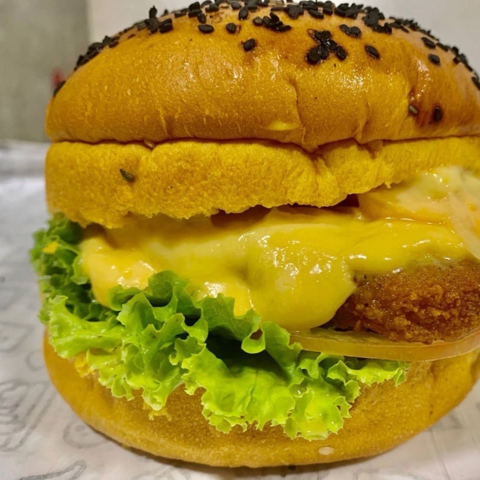 Pão de brioche, file de frango empanado, queijo prato, Catupiry, alface, tomate, cebola Roxa e molho el Shaday.