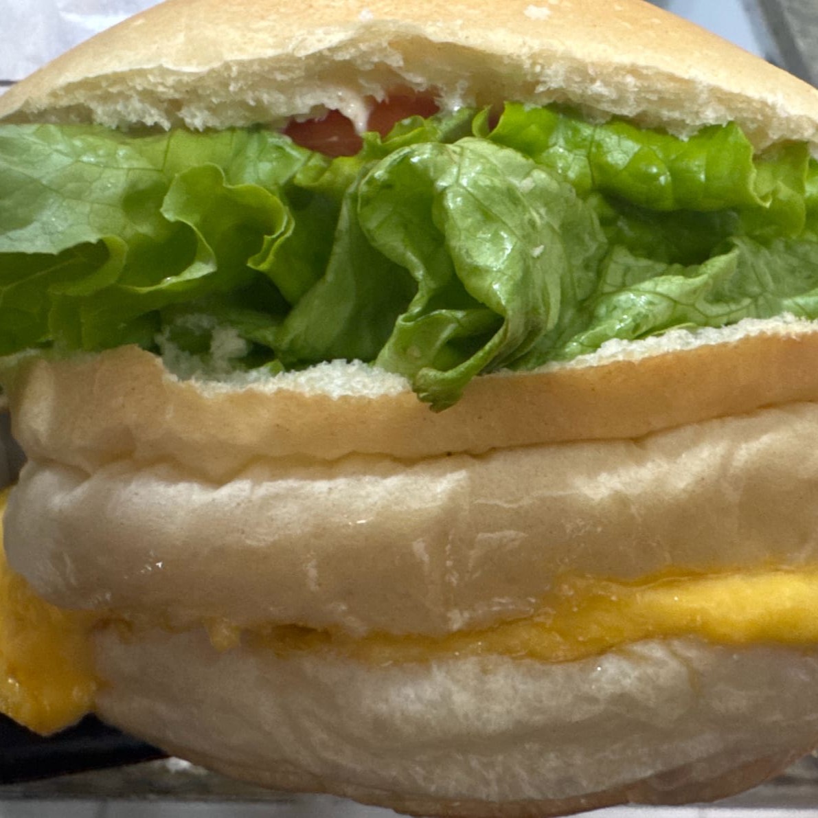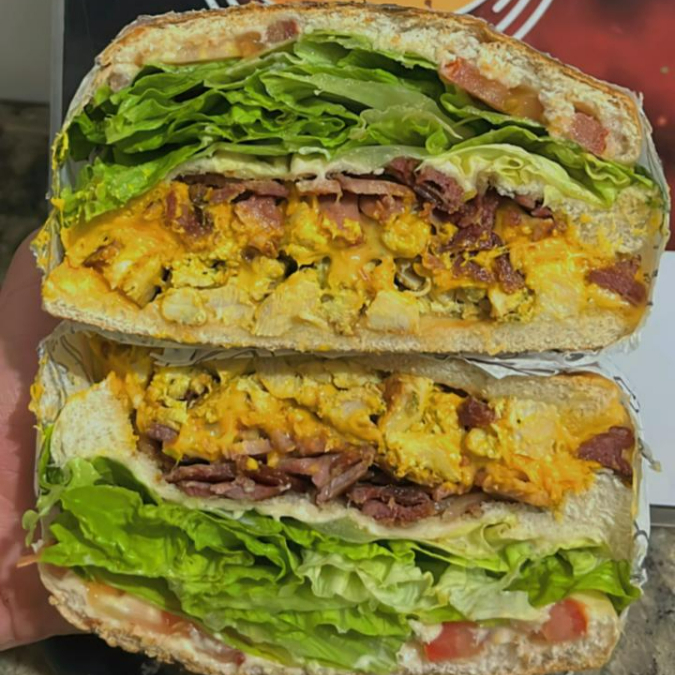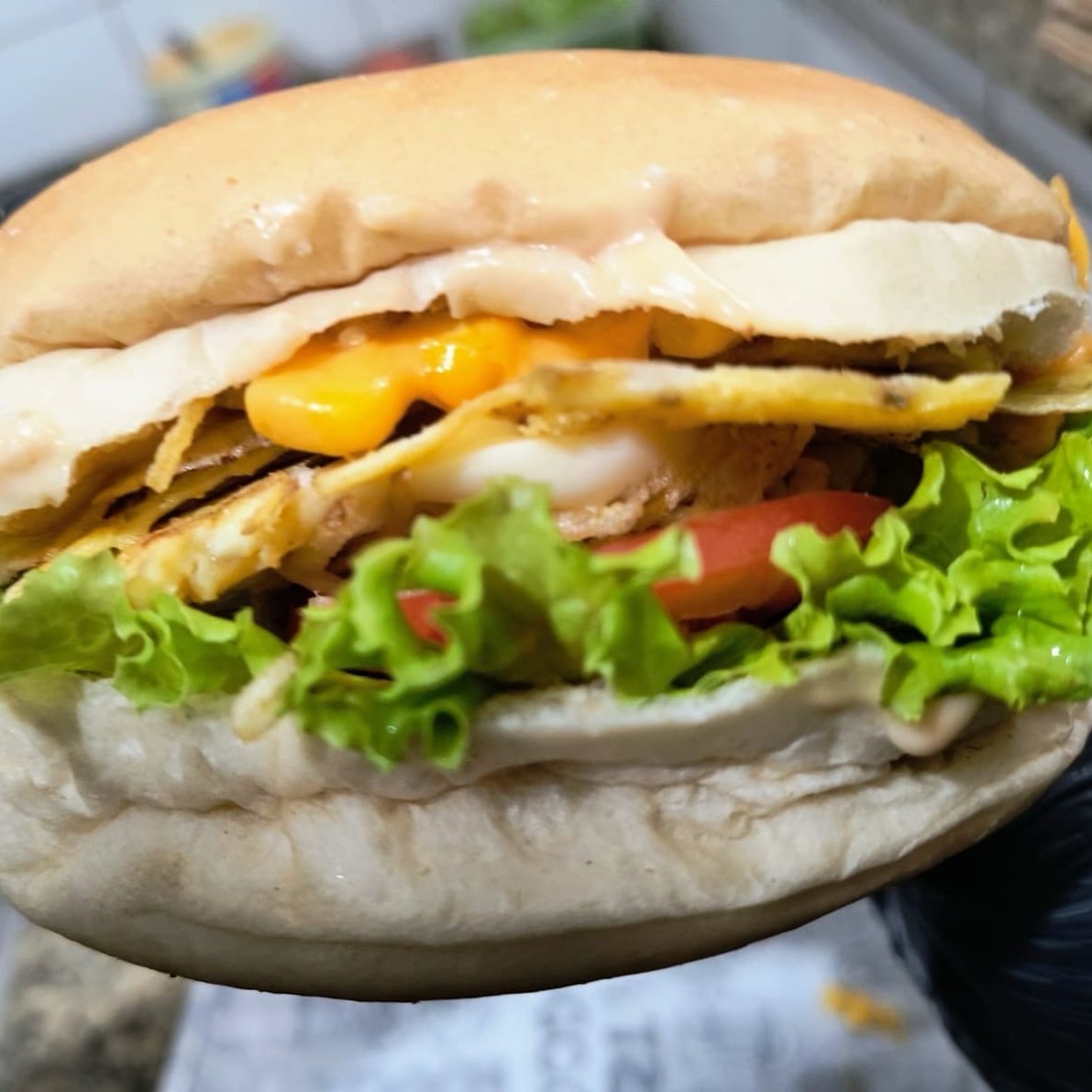 Pão de hambúrguer, omelete com 4 ovos, queijo prato, batata palha, milho, alface, tomate e molho el Shaday.