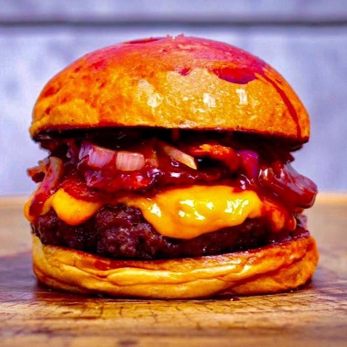 Pão de Brioche, Hambúrguer Artesanal de 150g, Queijo Prato, Cebola com Molho Barbecue, Bacon e Molho El Shaday.