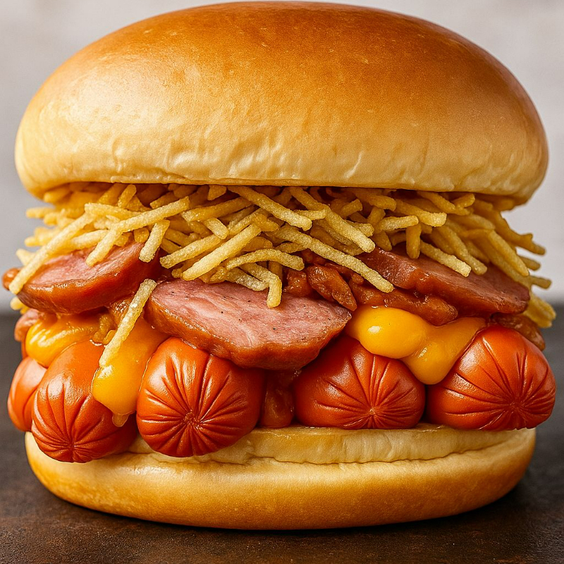 Pão de hambúrguer, 2x Salsichas, Cheddar, Bacon, Batata Palha, Ketchup, Mostarda e Molho El Shaday.