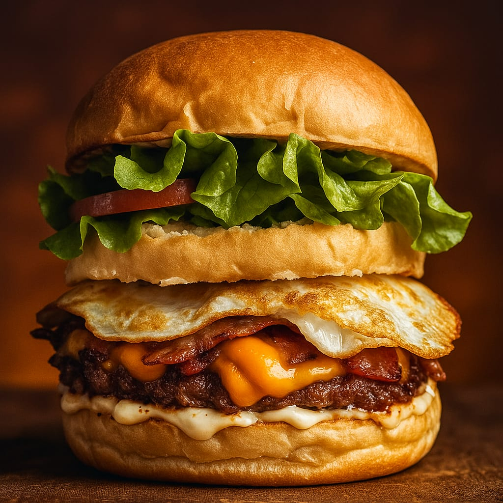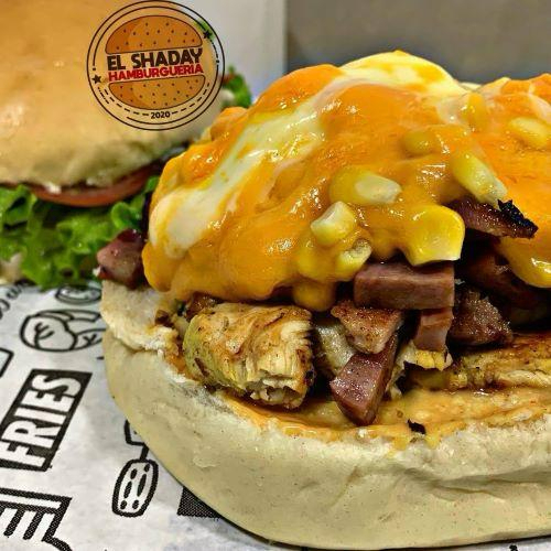 Pão, 2x Hambúrgueres 90g, 2x Queijo Prato, 2x Bacon,2x Ovo, Alface ,Tomate e Molho El Shaday.