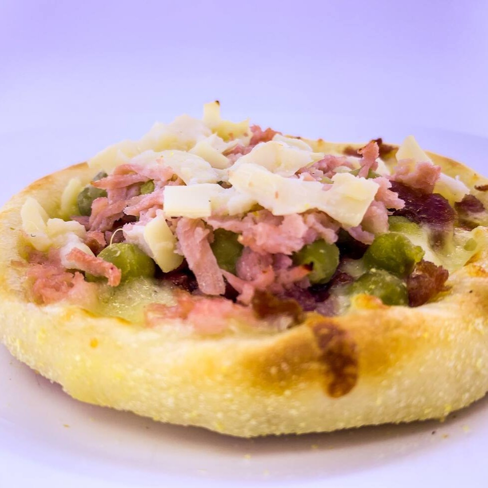Mussarela, ervilha, palmito, presunto e calabresa