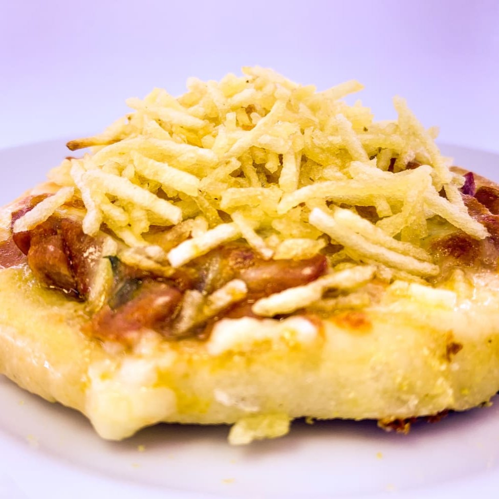Mussarela, salsicha, molho de tomate e batata palha.