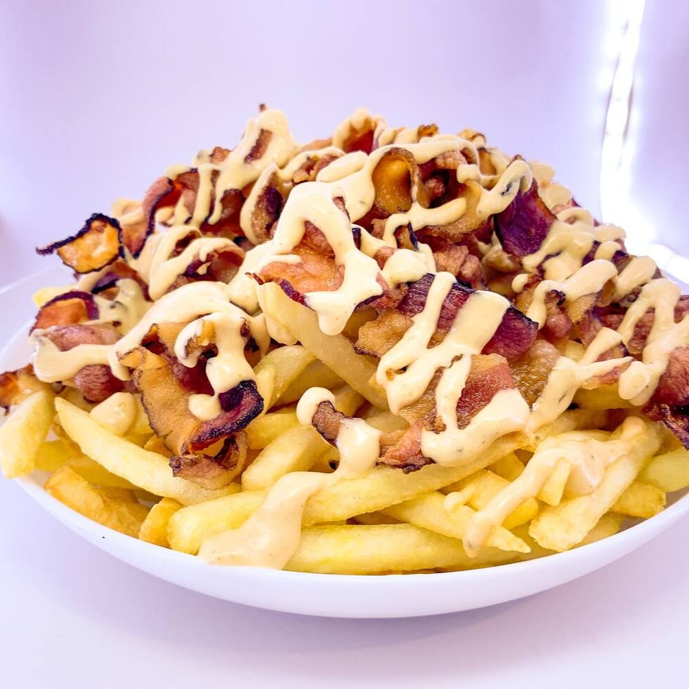 Porção de Fritas com bacon e molho da casa.