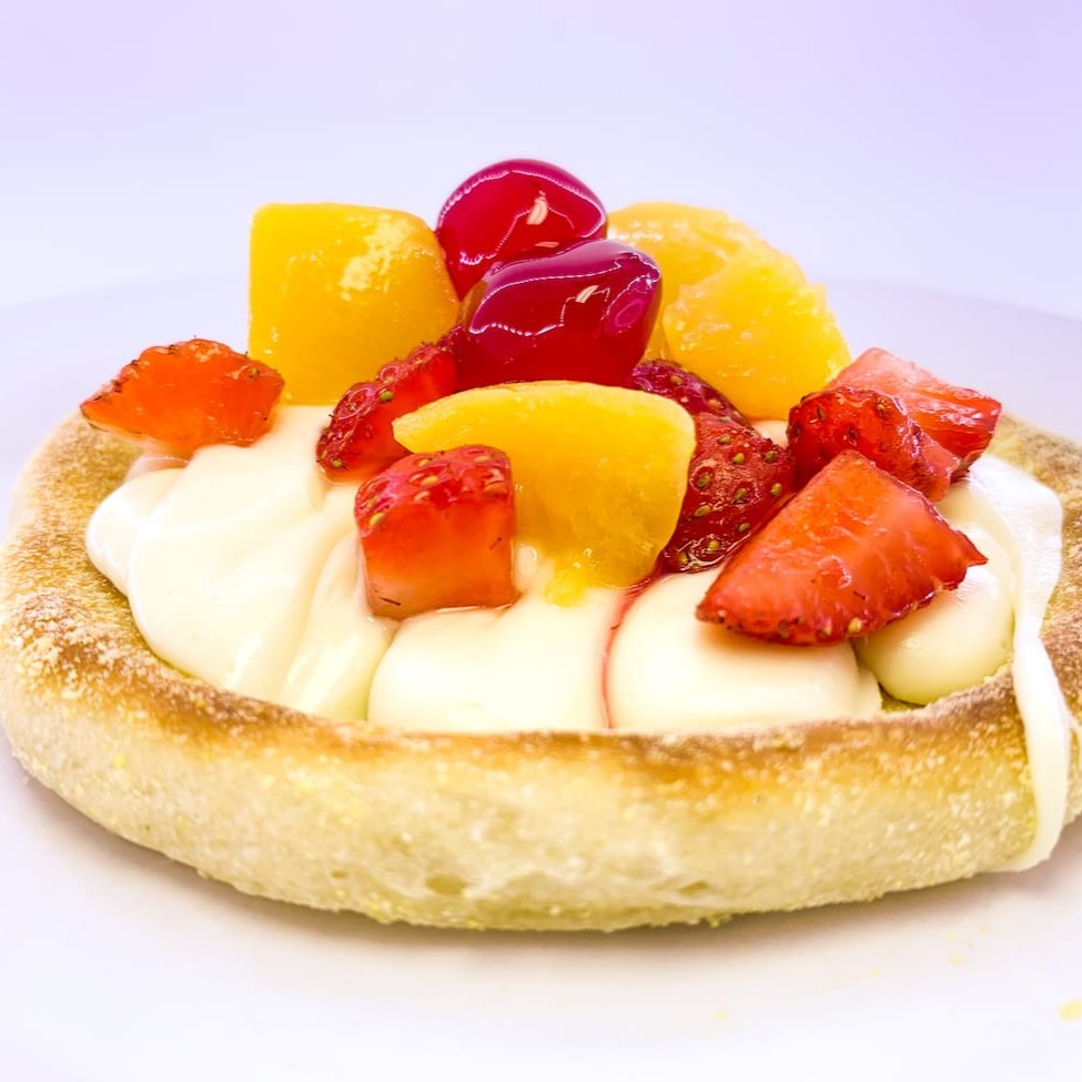 Creme de leite, chocolate branco, pêssego e cereja.