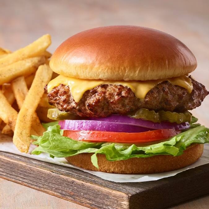 O nostálgico e tradicional burger... Pão de hambúrguer, hambúrguer 160g, queijo, alface americana com cebola roxa e tomate. Acompanha batata frita.