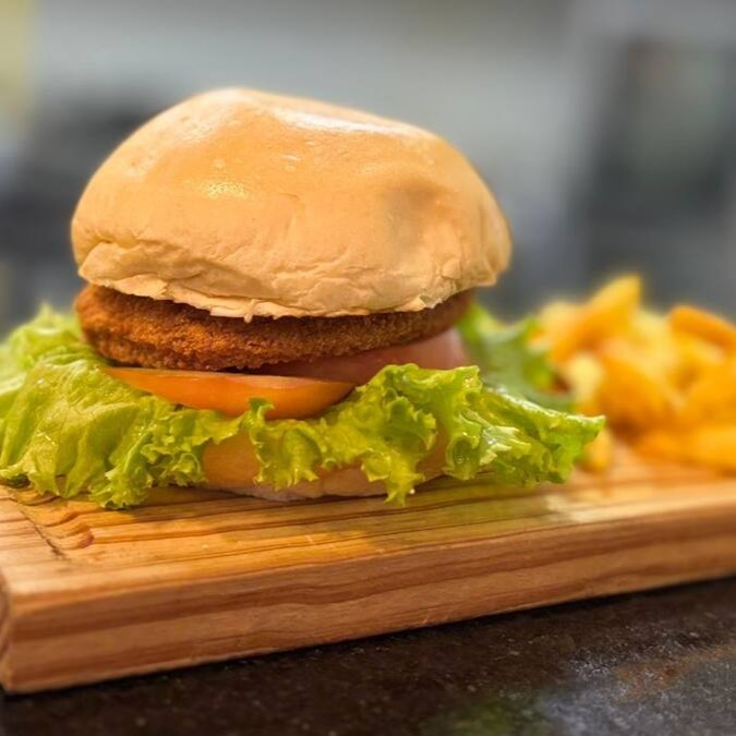 Sanduiche de frango, temperado e empanado, pão de hambúrguer, maionese, alface americana e tomate. Acompanha batata frita.