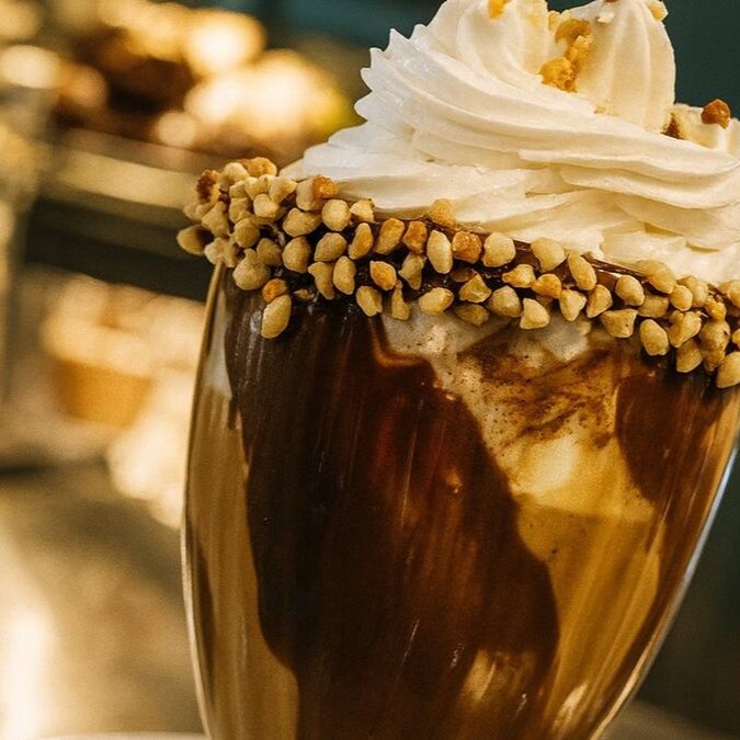 Uma dose de cappuccino, leite vaporizado, calda de chocolate e cobertura chantilly com amendoim.