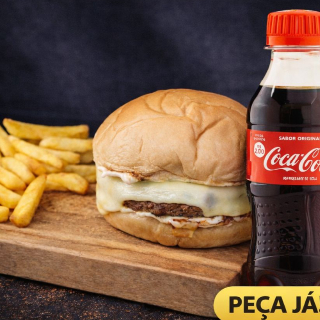 Pão de hambúrguer, hambúrguer artesanal 160gr e queijo. Acompanha batata frita e mini coca cola 200ml