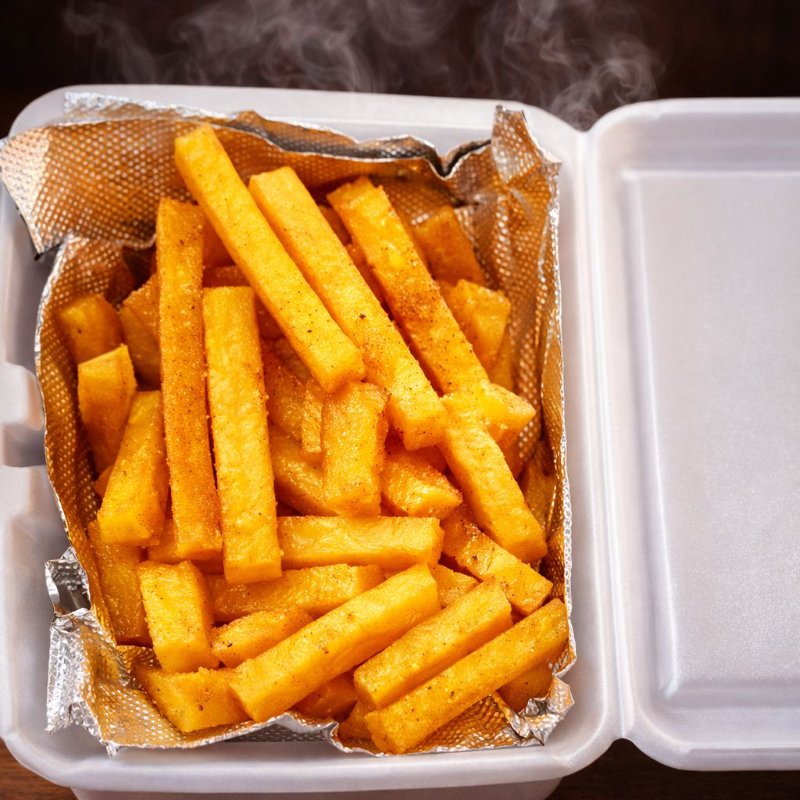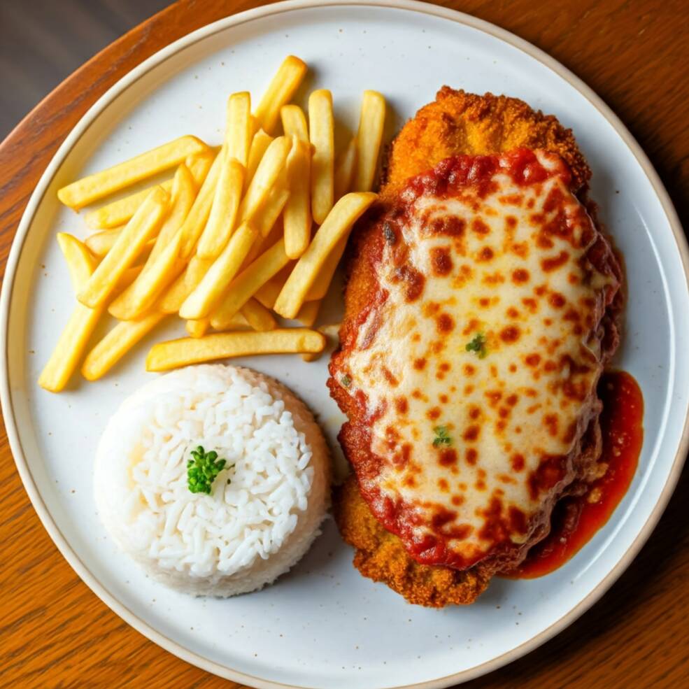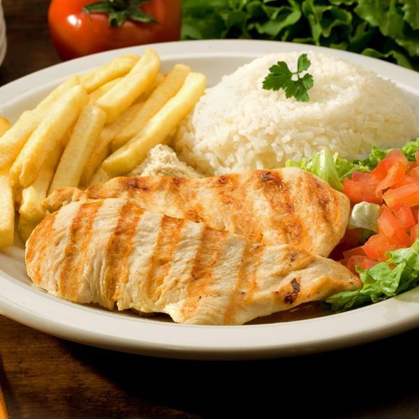 Filé de frango, molho de tomate, queijo, arroz e fritas. Serve 1 pessoa.