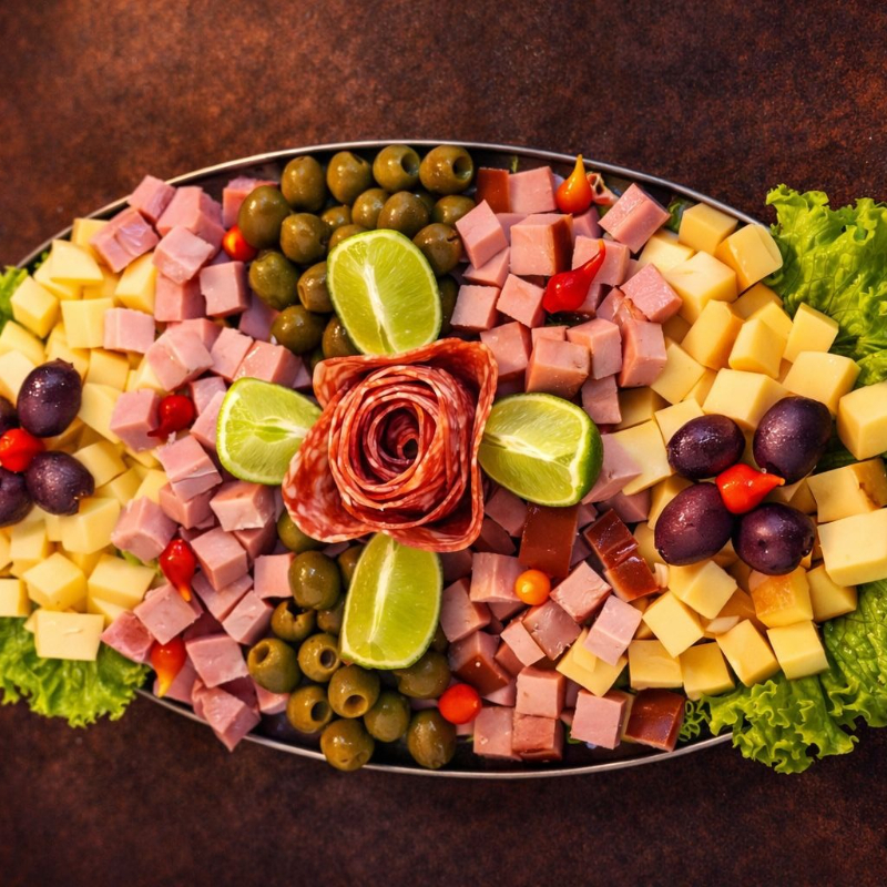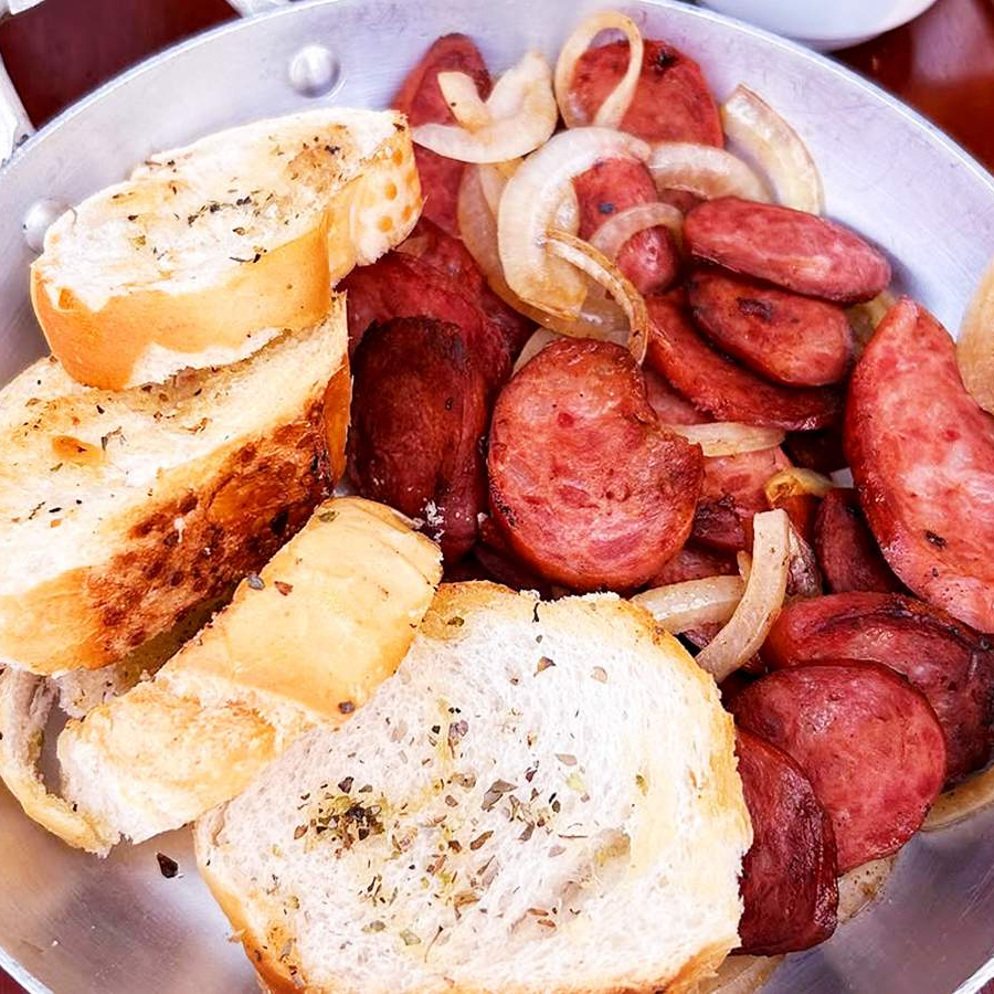 Frango a passarinho, calabresa e fritas + calabresa. Acompanha pão