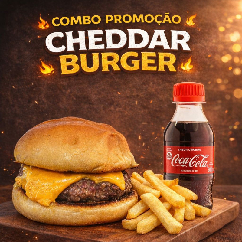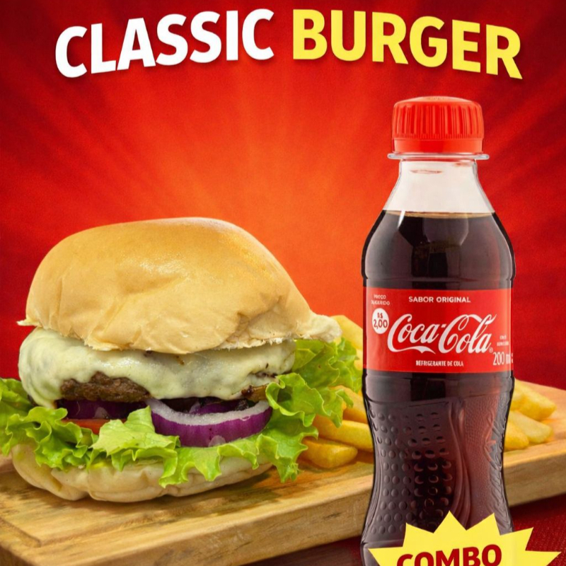 Pão de hamburguer, hamburguer artesal 160grs, cheddar cremoso e fatias de bacon crocante. Acompanha fritas e coca cola 200ml