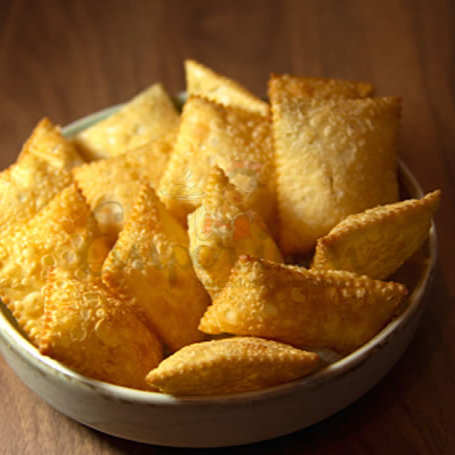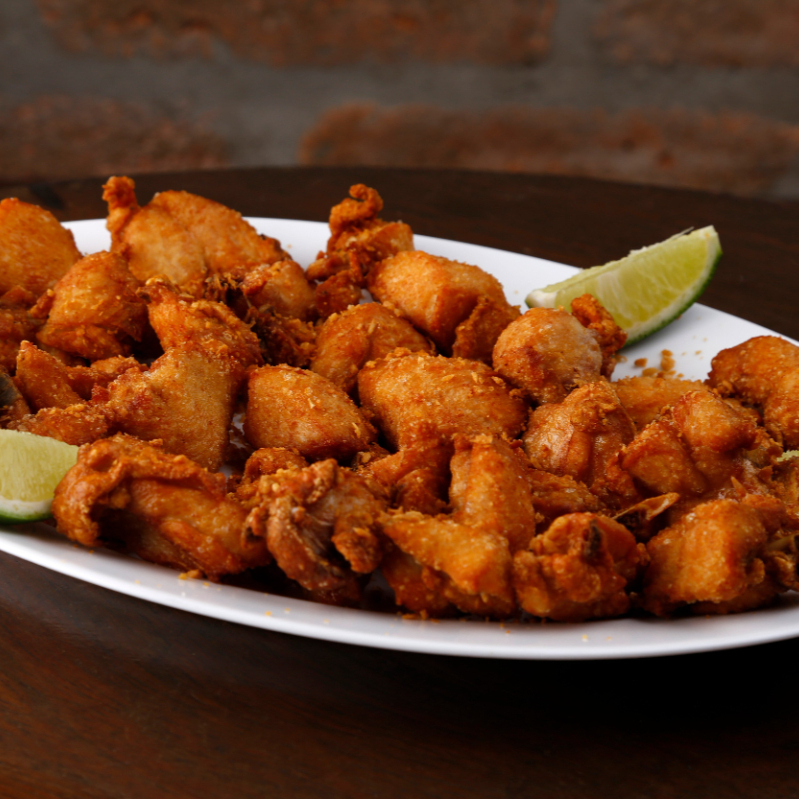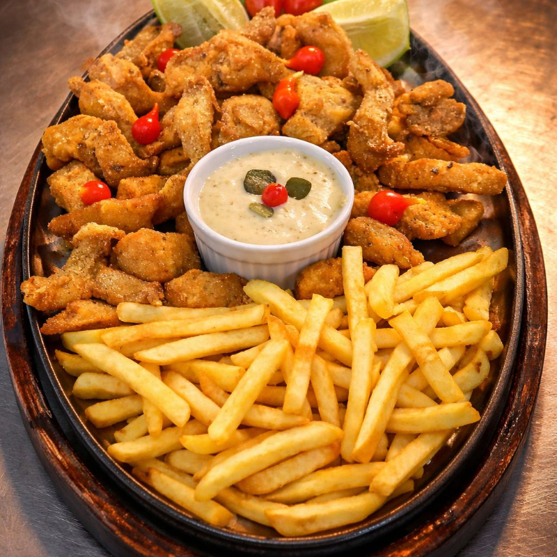 Pedaços de filé de coxa fritos até ficarem crocantes. Acompanha molho de alho.