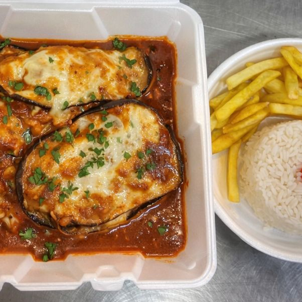 Berinjela, molho de tomate, queijo, arroz e fritas. Serve 1 pessoa
