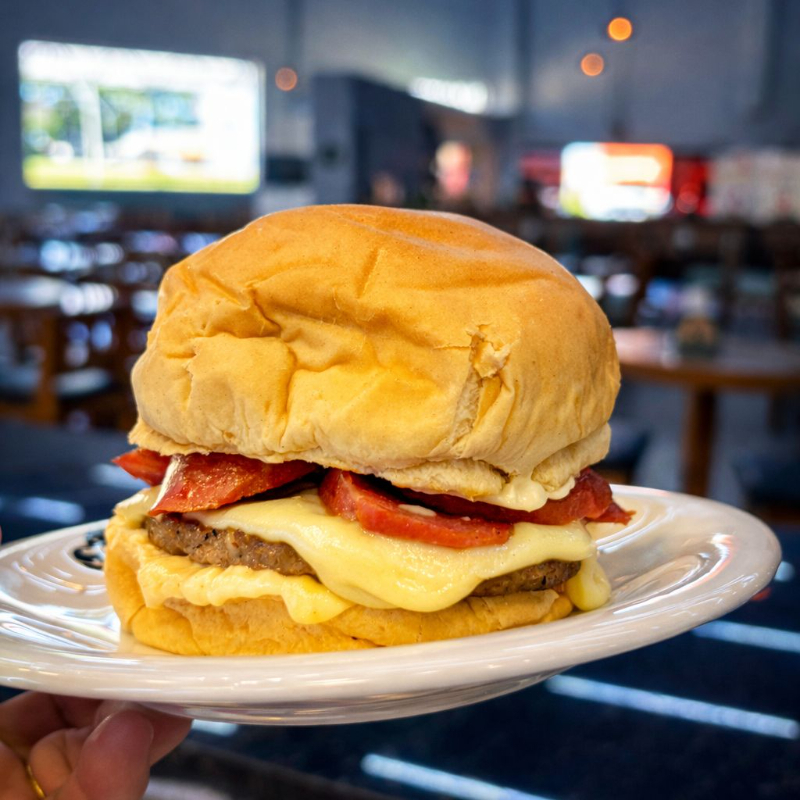 Pão de hambúrguer, hambúrguer 90g, calabresa em rodelas fritas com cebola, queijo mussarela derretido.