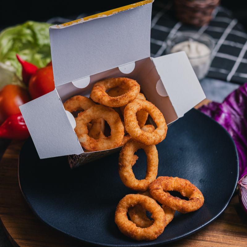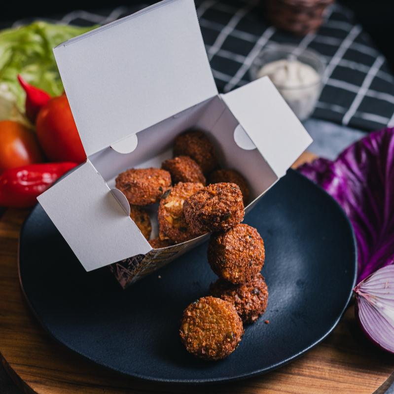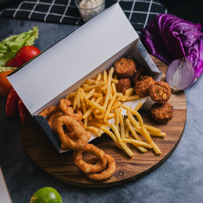 Mix dos nossos frititos com 160 gramas de batata frita supercrispy, 4 aneis de cebola e 4 falafel de grãos de bico