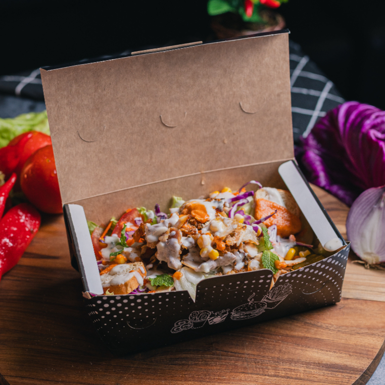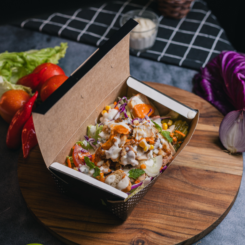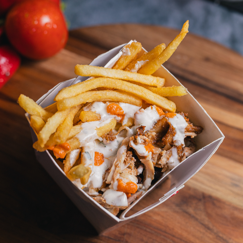 Caxinha com Kebab de Frango, batatas fritass supercrispy e os nossos deliciosos molhos, levemente picante e iogurte