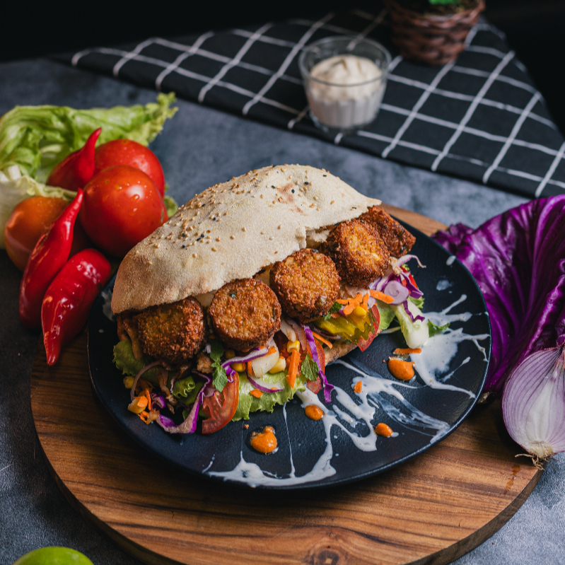 Salada de Alface Americana com o Nossos Falafel de grao de bico, deliciosos e proteicos e todos os complementos que voce adora