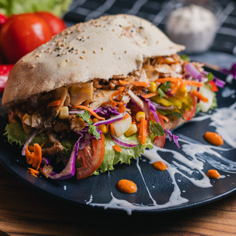Salada de Alface Americana com o Nosso succulento Kebab de carne e todos os complementos que voce adora