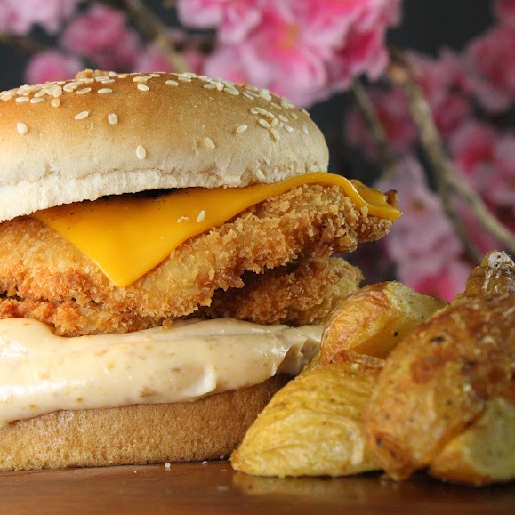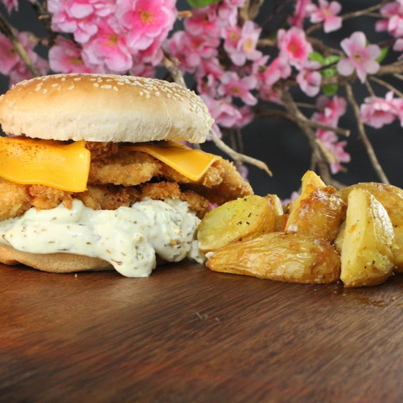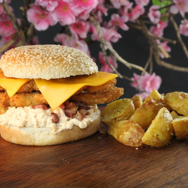 Saboroso Lanche de Frango (Torizinho de Baconnaise). Este prato é composto por um pão de hambúrguer brioche de 50 gramas levemente tostado, que envolve um suculento filé de frango. O filezinho Sassami, cuidadosamente empanado e frito, é coberto por um generoso queijo cheddar derretido. A maionese de bacon (Baconnaise) acrescenta um sabor rico e defumado ao conjunto. O acompanhamento é uma porção de batatas rústicas, crocantes por fora e macias por dentro. Obs:Não fazemos Alterações no produto!
