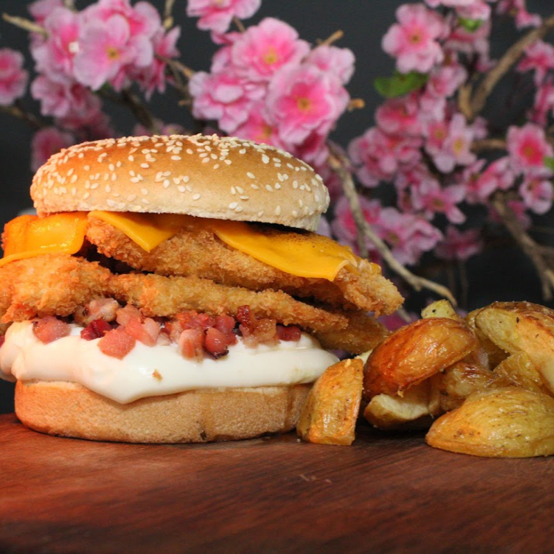 Saboroso Lanche de Frango - Tori Burger(Baconnaise) com Batata Rústica. Este prato é composto por um pão de hambúrguer 80 gramas levemente tostado, que envolve um suculento filé de frango. O filezinho Sassami, cuidadosamente empanado e frito, é coberto por um generoso queijo cheddar derretido. A maionese de bacon (Baconnaise) acrescenta um sabor rico e defumado ao conjunto. O acompanhamento é uma porção de batatas rústicas, crocantes por fora e macias por dentro. Uma deliciosa opção da categoria 'Lanche do Japa Loko'. Obs:Não fazemos Alterações no produto!