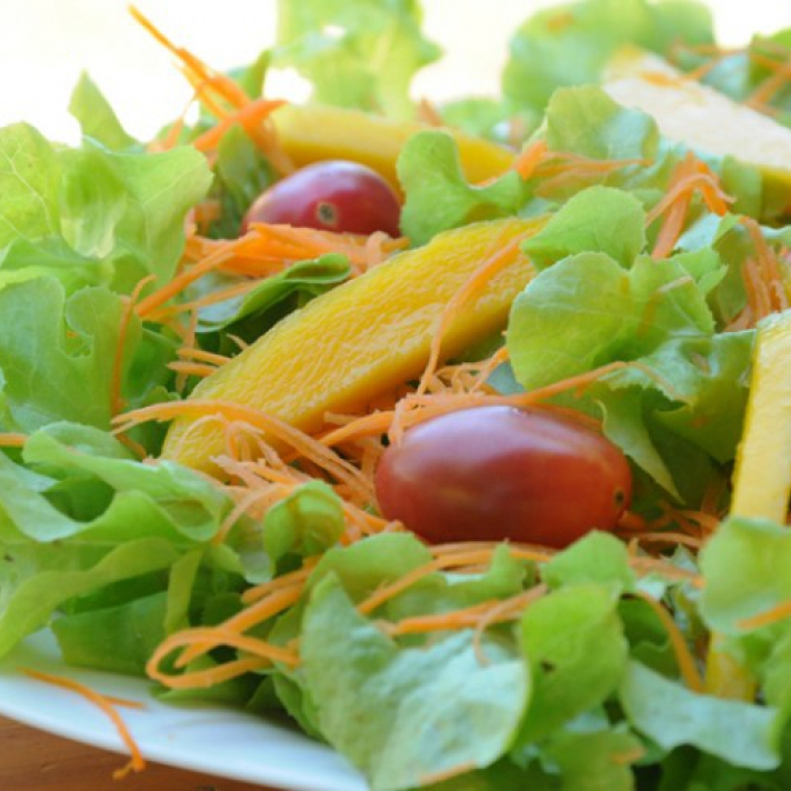 Alface, tomate, cebola, azeitona, lascas de parmesão e caponata de berinjela.