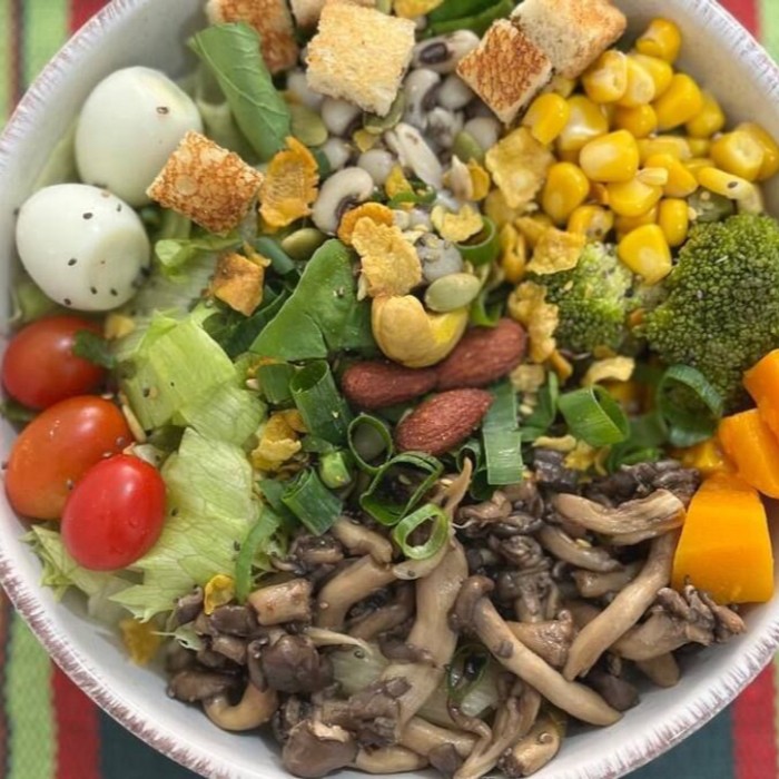 Salada fresca com proteínas e ingredientes selecionados para uma refeição equilibrada, acompanhada da sua bebida favorita. Leve, saudável e prático para o seu Dia!