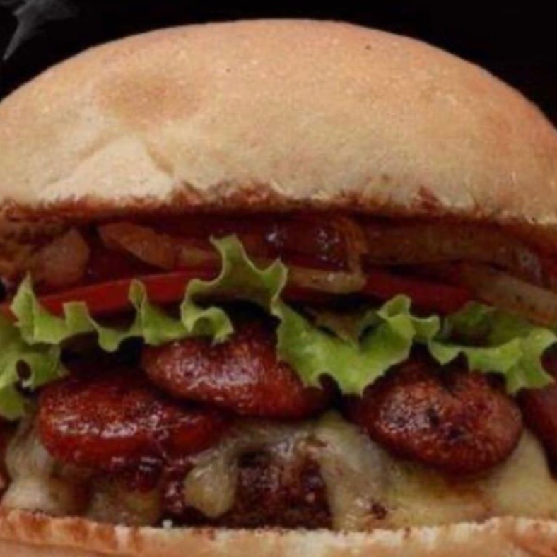 Pão de hamburguer, 1 hamburguer artesanal de 100g, calabresa chapeada, 50g de queijo mussarela, tomate e alface. Imagem meramente ilustrativa.