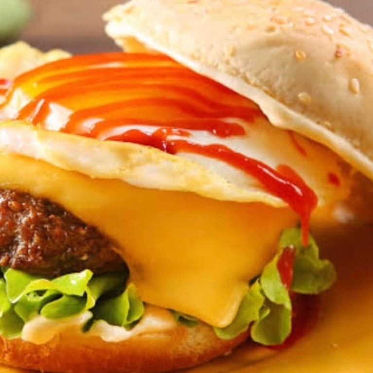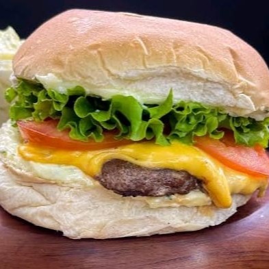 Pão de hambúrguer, 1 hambúrguer artesanal de 100g, ovo chapeado, tomate, 50g de queijo mussarela e alface. Imagem meramente ilustrativa.