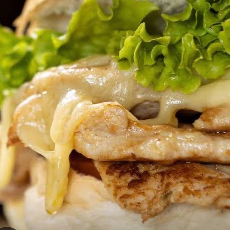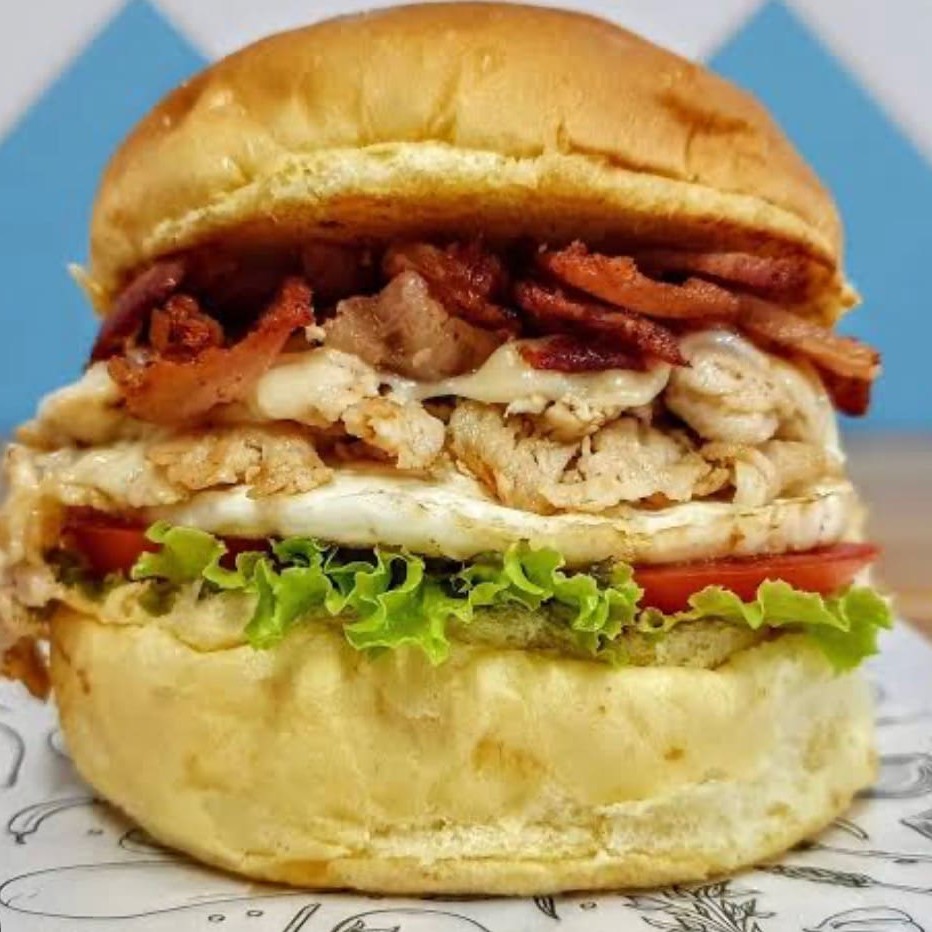 Pão de hambúrguer, 120g de filé de frango grelhado, 50g de queijo mussarela, bacon defumado, ovo chapeado, tomate e alface. Imagem meramente ilustrativa.