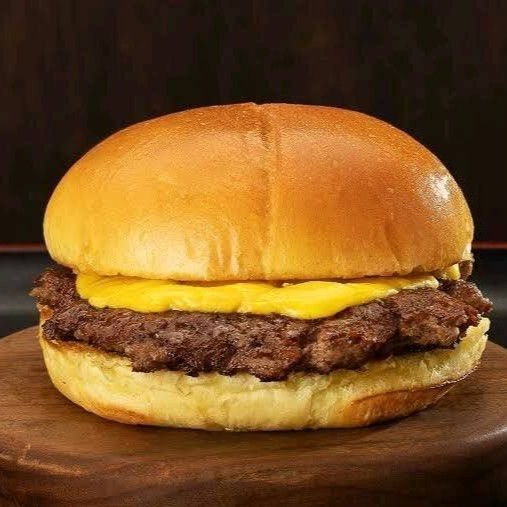 Pão de hamburguer, 1 hambúrguer artesanal de 100g e 100g de queijo mussarela. Imagem meramente ilustrativa.