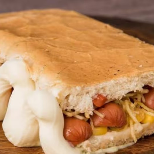 Pão: 2 salsichas, milho, Catupiry, mussarela, purê de batata, batata palha ( maionese, catchup, mostarda)