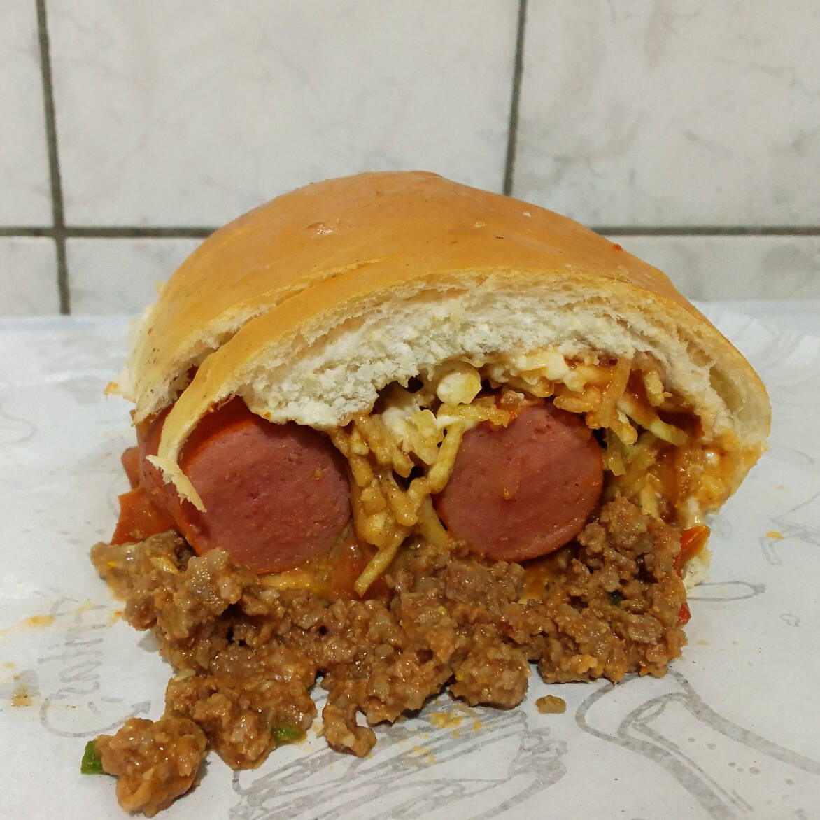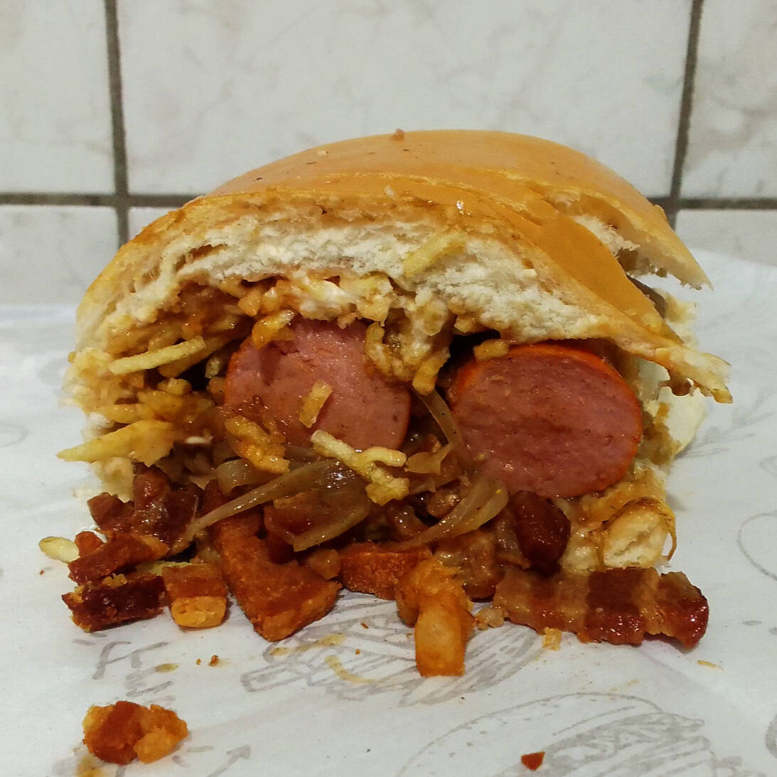Pão, 2 salsichas, carne moída com molho bolonhesa, bacon, vinagrete, batata palha, catchup, mostarda e maionese