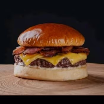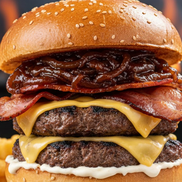 Pão brioche, 2 hamburgue 120g na brasa, mussarela, bacon, cebola caramelizada no barbecue e maionese