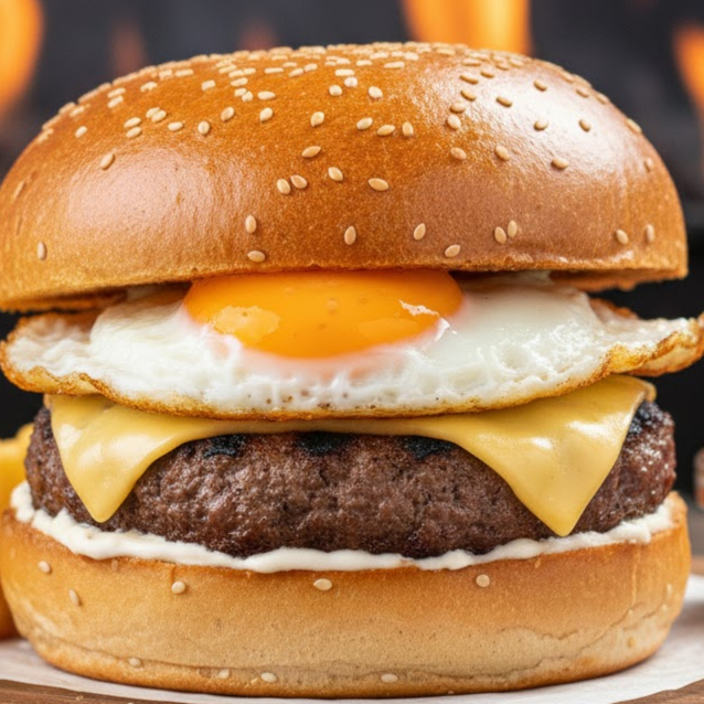 Pão brioche, hamburgue 120g na brasa, mussarela, ovo e maionese