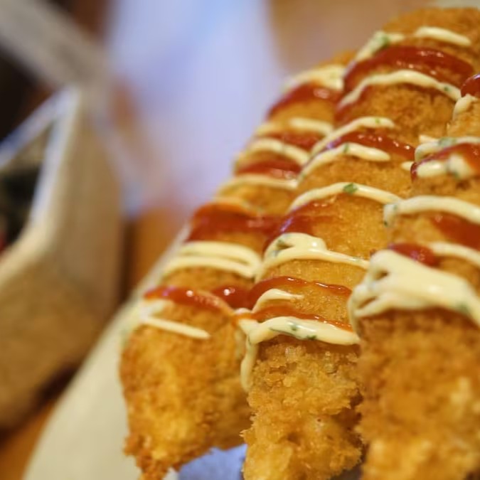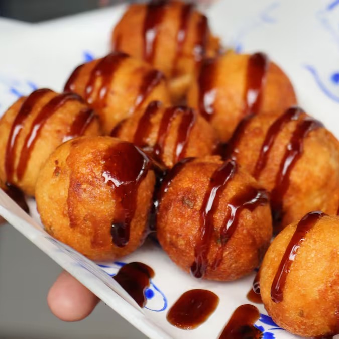 8 bolinhos de polvo deliciosos finalizados com molho tarê e gergelim