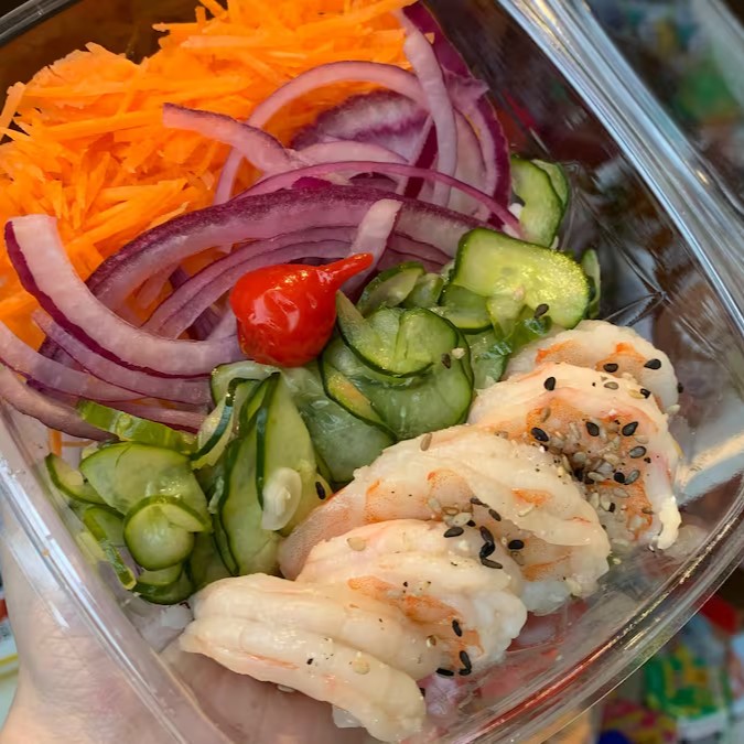 O pokê é composto por: shari (arroz japonês temperado), sunomono, cenoura ralada, cebola roxa, alga, pimenta biquinho e camarão cozido. Finalizado com gergelim.