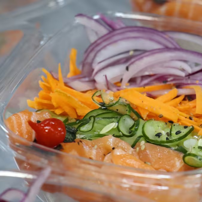O pokê é composto por: shari (arroz japonês temperado), sunomono, cenoura ralada, cebola roxa, alga, pimenta biquinho e a salmão cru. Finalizado com gergelim.
