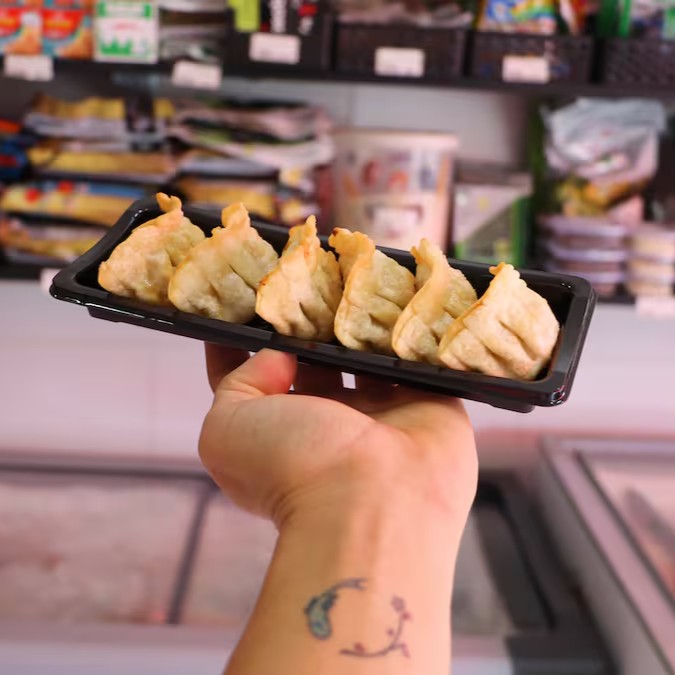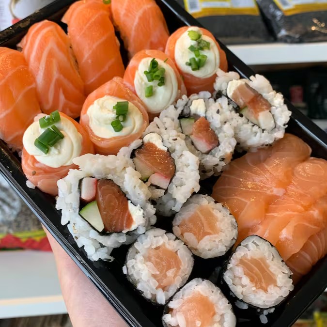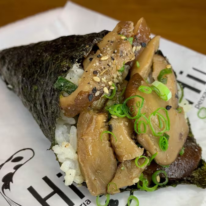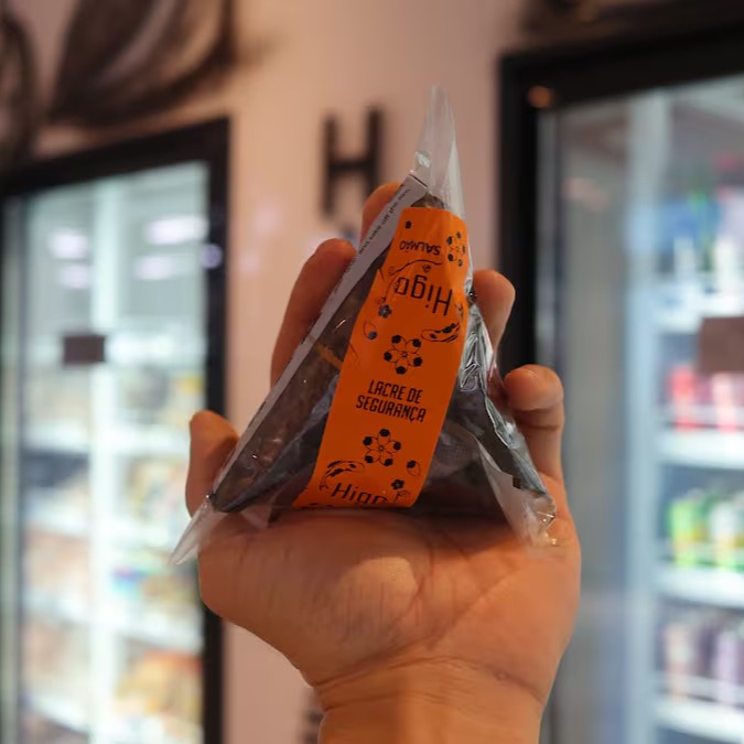 Bolinho de arroz envolto de alga nori embalada. A embalagem serve para manter a crocância da alga. Escolha o recheio de sua preferência nas próximas etapas